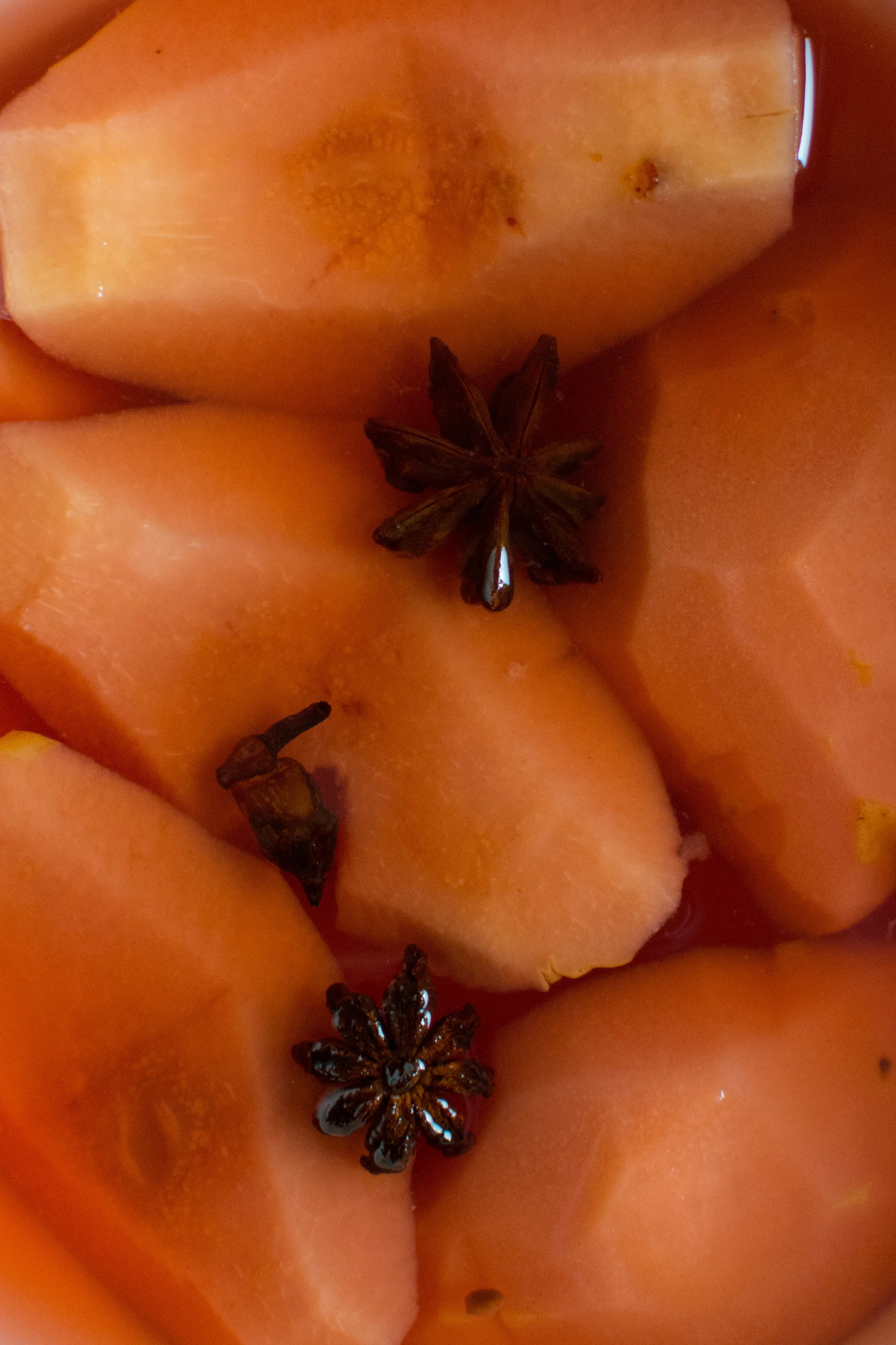 1. In a large saucepan, combine water, sugar, lemon juice, star anise and cloves. Heat over medium heat.